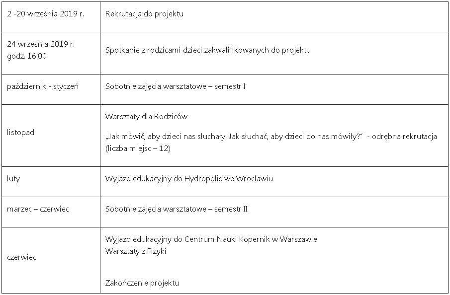 W ramach projektu przewidziano udziału 72 dzieci w podziale na 6 grup ćwiczeniowych (podział wiekowy dzieci). Każda grupa w ramach całego roku zrealizuje 60 godzin zajęć warsztatowych. Wszystkie zajęcia odbywać się będą w soboty w PWSZ w Nysie.