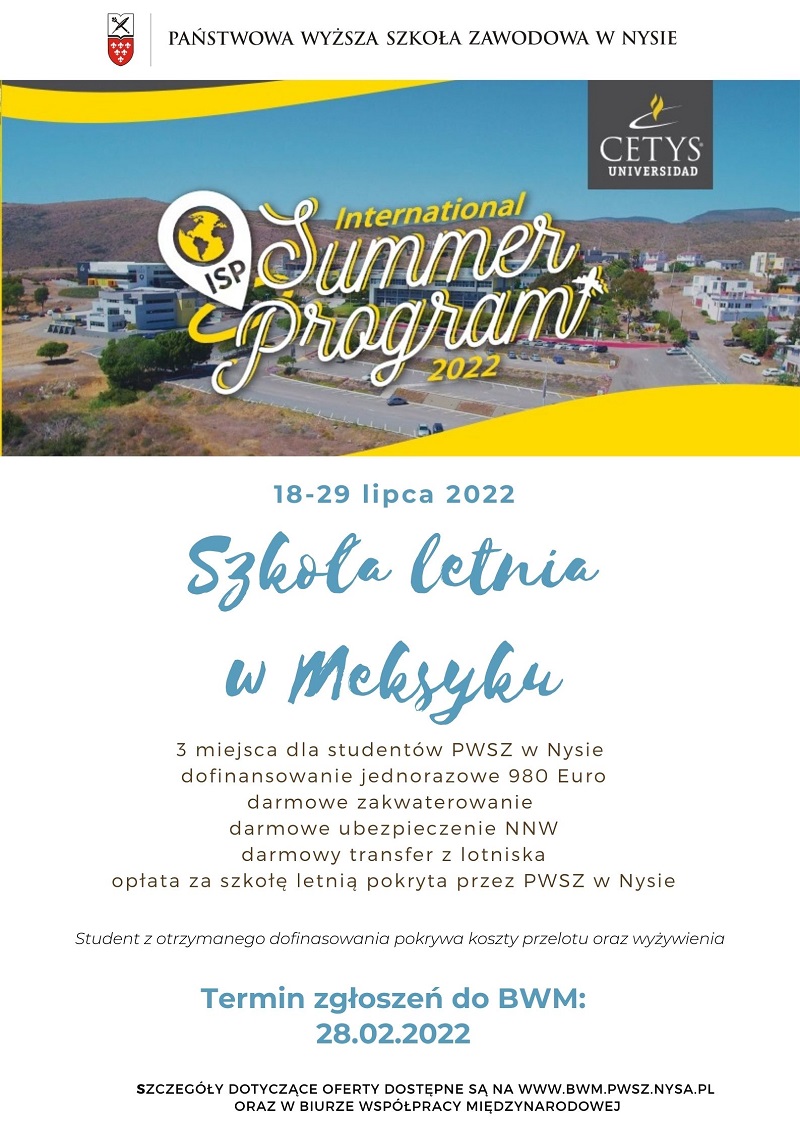 W ramach współpracy PWSZ w Nysie oraz CETYS Universidad 3 studentów może wziąć udział w Szkole Letniej, która obejmuje następujące kursy: Innovation and New Product Development, International Marketing, Negotiation Strategies, Project Management, Strategic Management, Sustainability and Competitiveness, Business Intelligence, International Experiences in Latin American Studies. Za zrealizowany kurs student otrzyma punkty ECTS na podstawie Learning Agreement uzgodnionego przez wyjazdem.