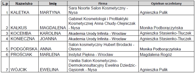 W ramach przeprowadzonego pierwszego naboru studentów do udziału w Programie praktyk zawodowych w Państwowych Wyższych Szkołach Zawodowych”, realizowanym w ramach PO WER - Oś III Szkolnictwo Wyższe dla gospodarki i rozwoju, komisja konkursowa zakwalifikowała następujących studentów z III roku Kierunku Kosmetologia do udziału w projekcie.