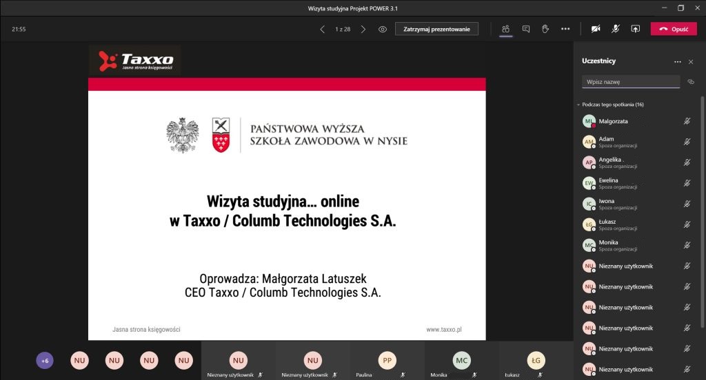 W dniu 15 stycznia 2021 studenci drugiego roku kierunku finansów i rachunkowość wzięli udział w wizycie studyjnej on-line w Taxxo / Columb Technologies S.A. ul. Łubinowa 1 f/7, 52-210 Wrocław. Wizytę prowadziła Pani Małgorzata Latuszek, Prezes Zarządu.